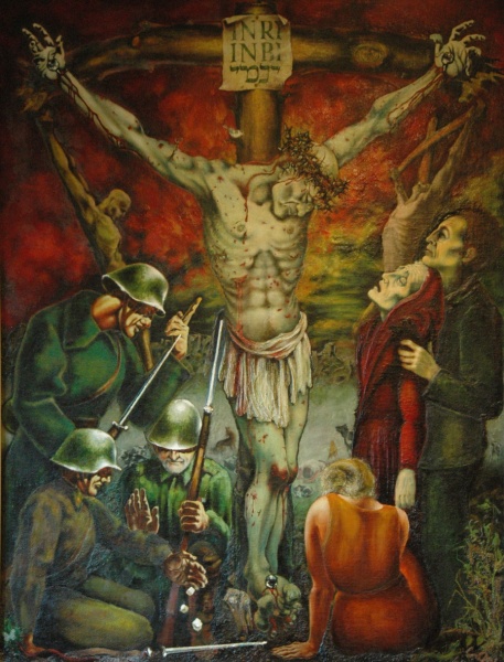 Aus Spenden wurde das Triptychon von Stephan Guber 2015 erworben. Es hängt unter der Südempore am romanischen Taufstein. Es entstand über einen längeren Zeitraum aus Naturmaterialien, die der Künstler der Grabungs- und Baugrube für den Neubau neben der Dankeskirche entnommen hat – Erde, Lehm und salzhaltiges Material. Basale Elemente aus dem Boden unserer Kirche, aus der unmittelbaren Nachbarschaft. Der kreative Schaffensprozess des Kunstwerkes erinnert an den Schöpfungsakt des Menschen aus der Erde, aus Lehm.