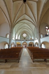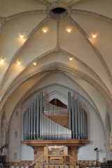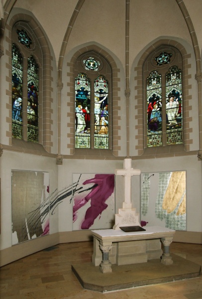 Die Wandgestaltung des Chorraums stammt aus dem Jahr 2006 und wurde von Tobias Kammerer gestaltet. In minimalistischer Form nehmen die Wandtafeln das Thema der Chorfenster auf. Das Silber steht für Weihnachten (Stern über Bethlehem), die violette Farbe für Kreuzigung und Tod, das Gold für Auferstehung. Die schwarze, strichartige Übermalung kann als die Lebenslinie Jesu Christi verstanden werden.