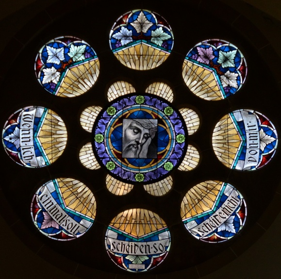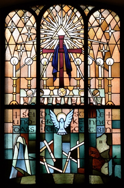 Es ist eine aufsteigende Linie. Die Bilder korrespondieren untereinander: Tod findet sich auch im Weihnachtsbild (Kindermord zu Bethlehem) oder bei der Auferstehung (Wundmale Jesu). Und sie stehen in Kontrast zu den beruhigenden, eher statischen Fenstern darüber, in denen der Tod Jesu als ein Triumph dargestellt wird. Das dicke, pastose Violett erzählt vom Leiden und beschönigt es nicht.